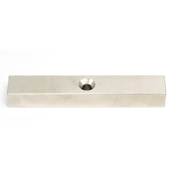 Magnet puternic neodim bloc 120 x 20 x 15 mm cu gaură și șanfren D7 / D12 mm, placat cu nichel, magnetizare N45, forța 45 kg. Magneți neodim prevăzuți cu gaură pentru prindere cu șurub.